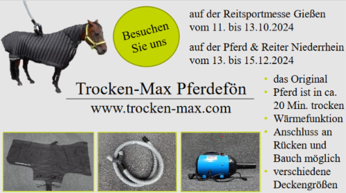 Wie immer mit dabei: der Trocken-Max Pferdefön und die Trocken-Max Wellnessdecke für Pferde und natürlich wieder einige Angebote